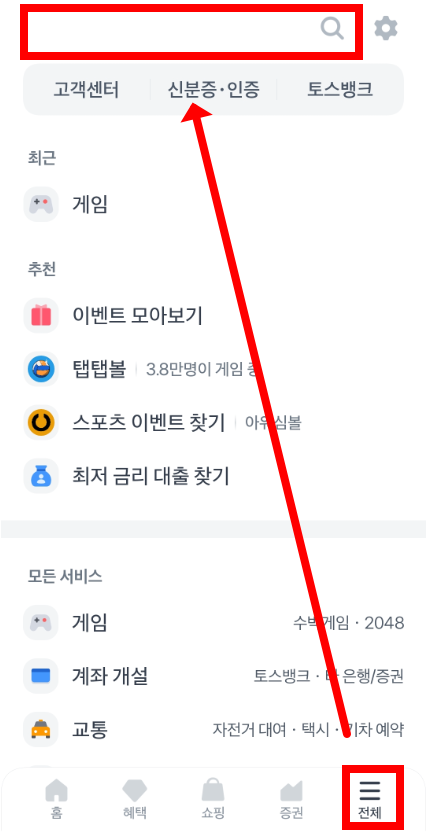 - 토스 앱 실행 → 하단 ‘전체’ 메뉴 클릭