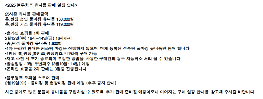 | 오프라인 판매 | 2월 19일(목) 이후 | 블루윙즈 스토어 매장 판매 |